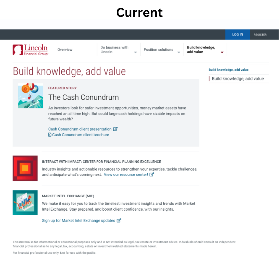In order to comprehensively assess the user experience, I conducted an analysis of the entire flow from the first time users are exposed to the resources. This analysis revealed several challenges contributing to low user sign-ups. Users can freely access information on the public site without the necessity to log in or register for the secure experience. Additionally, a lack of incentivization was identified as a key factor in discouraging users from signing up.