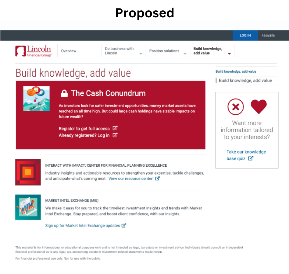 To tackle the lack of incentives, I proposed a layout redesign. Key resources would be gated behind registration, incentivizing users to sign up. Additionally, I envisioned a content curation tool to provide personalized insights and product recommendations, driving conversion rates higher. This tool serves a dual purpose, offering deeper insights into user preferences from a business perspective while simultaneously informing users about available products upon completing the signup process.