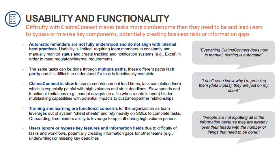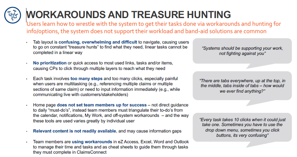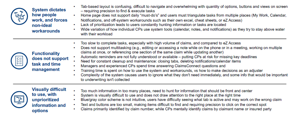 I conducted interviews with 8 ClaimsConnect users to understand needs and pain points and assess overall high-level usability of the ClaimsConnect system. ClaimsConnect includes all content users need to do their jobs, but does not have adequate usability and intuitive support for users to manage their tasks and time without workarounds and idle / lost time