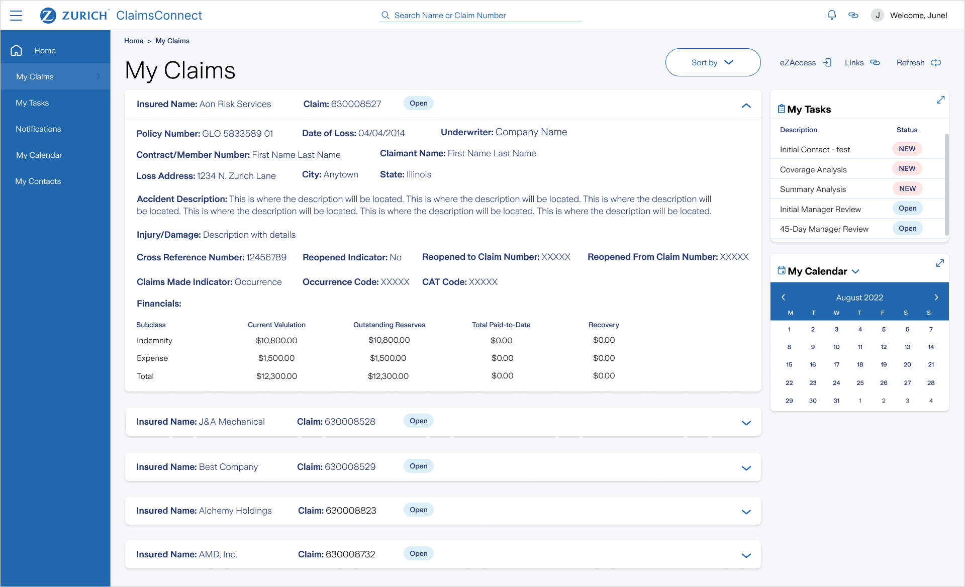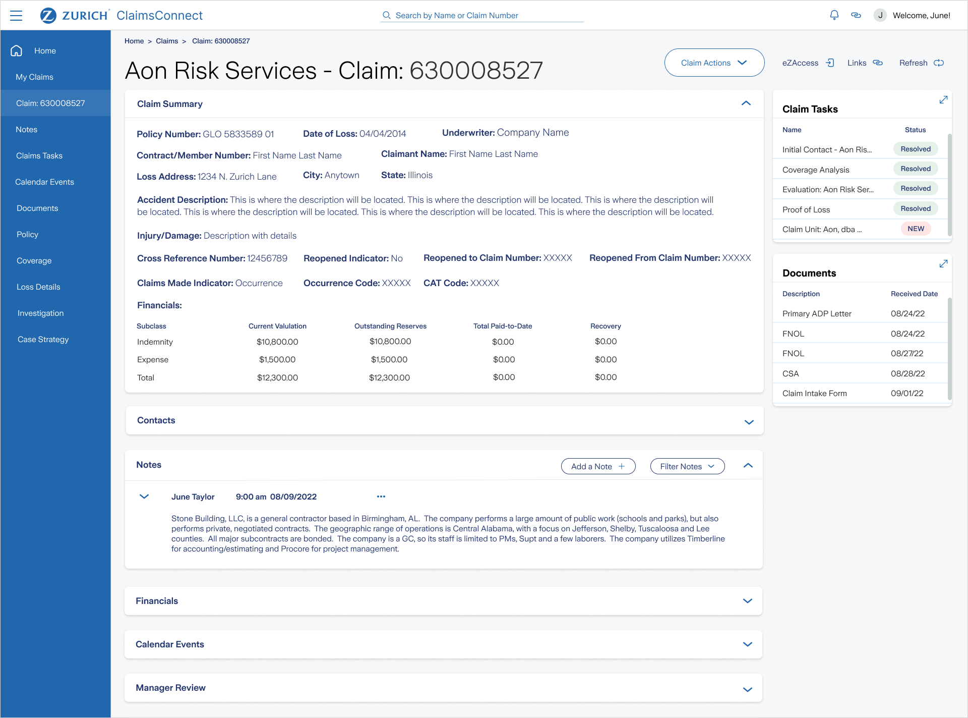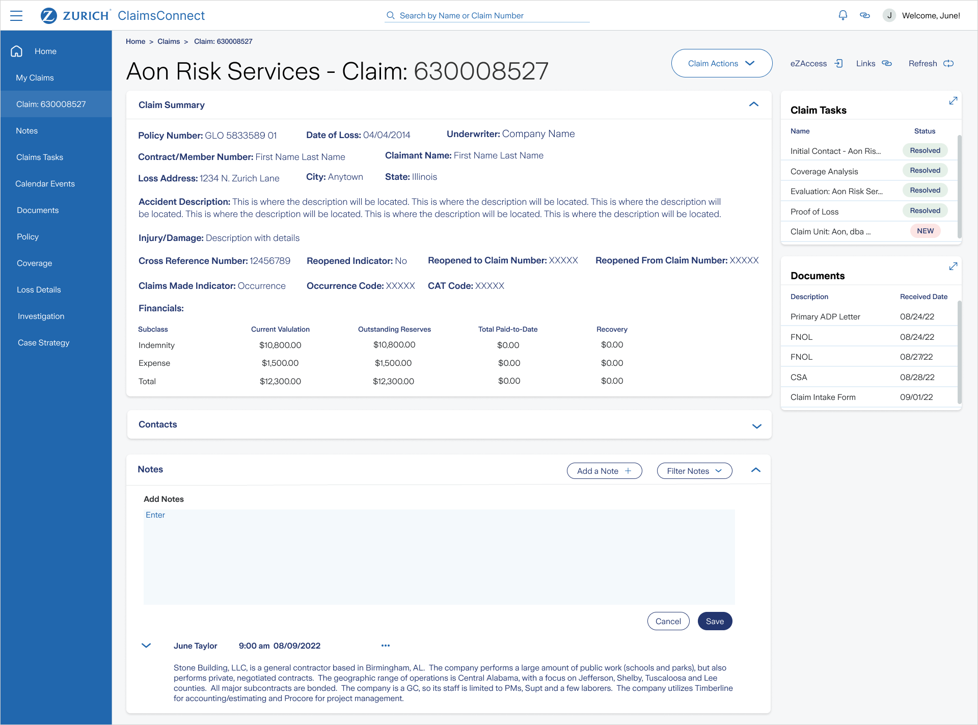 - Claims Detail Screen, Tasks List, Claim Summary, Contacts, Notes, Documents
